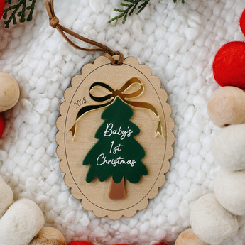 Celebrate the magic of a first Christmas with a keepsake that’s made to be cherished for years. Each ornament is handcrafted with layered wood and acrylic, featuring a festive Christmas tree and bow design that captures the joy of your baby’s very first holiday season.