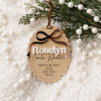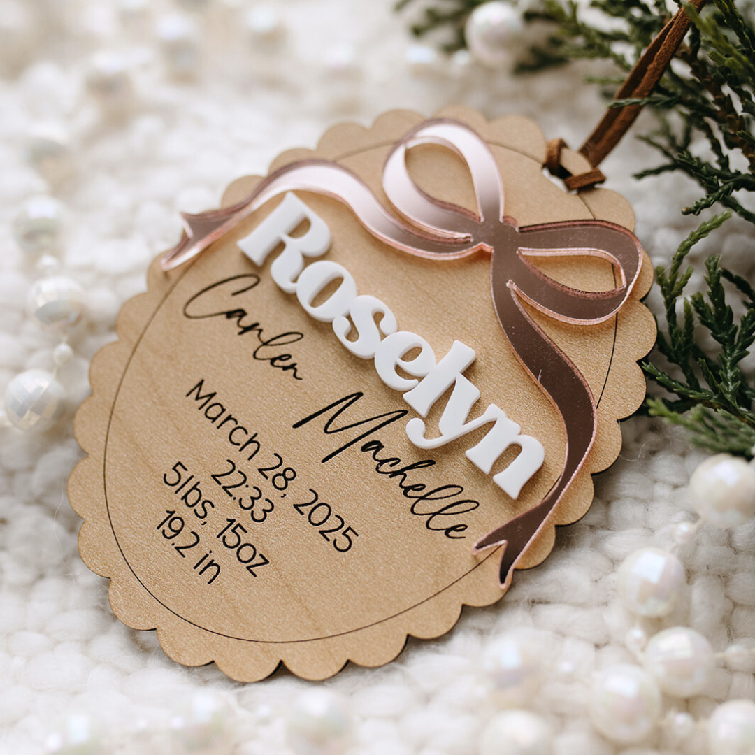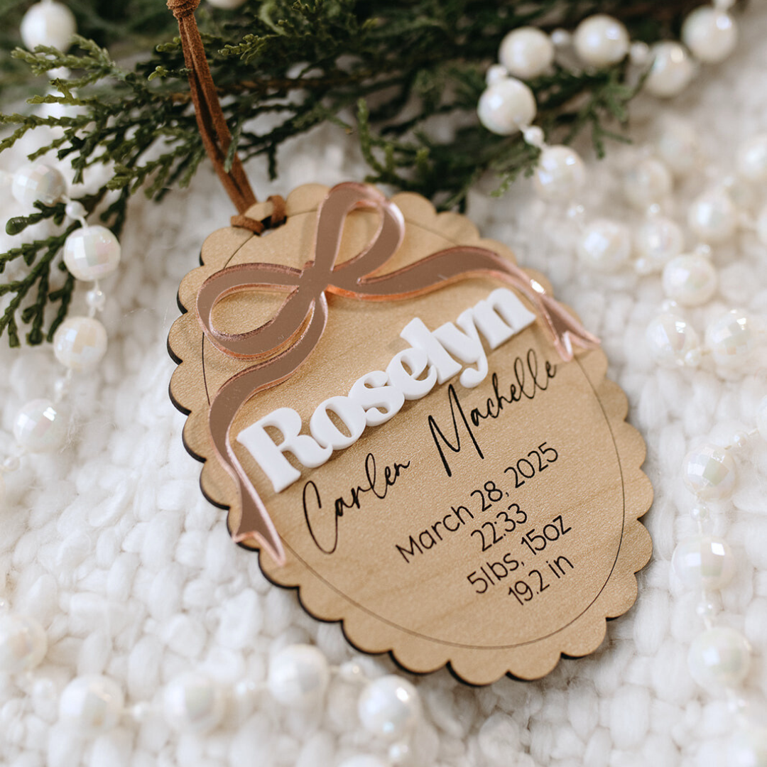 Custom Birth Stat Ornament with Bow – Baby’s First Christmas Keepsake