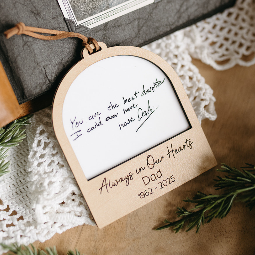 Honor the memory of someone special with a keepsake that preserves their handwriting exactly as it was written. This Handwriting Memorial Ornament is designed to hold a handwritten note, signature, or message, creating a deeply personal tribute that can be displayed on your Christmas tree or cherished year-round. Crafted from layered wood and acrylic and personalized with a name and years, it’s a heartfelt way to keep their words close.