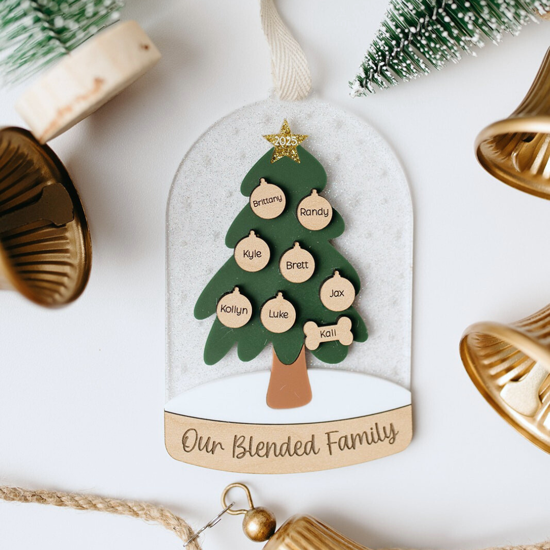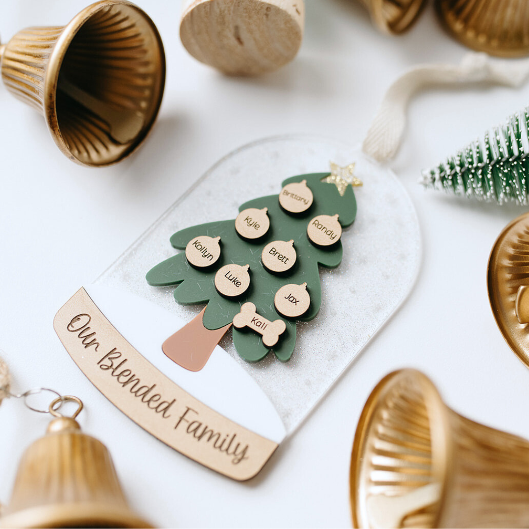 Crafted with layered acrylic and detailed laser engraving, this charming ornament features a festive Christmas tree adorned with customizable name bulbs. Whether your family is blended, big, small, full of pets, or carrying memories of those no longer here, this keepsake captures it all with intention and love. Display it proudly on your tree or gift it to someone who cherishes the magic of family just as much as you do.