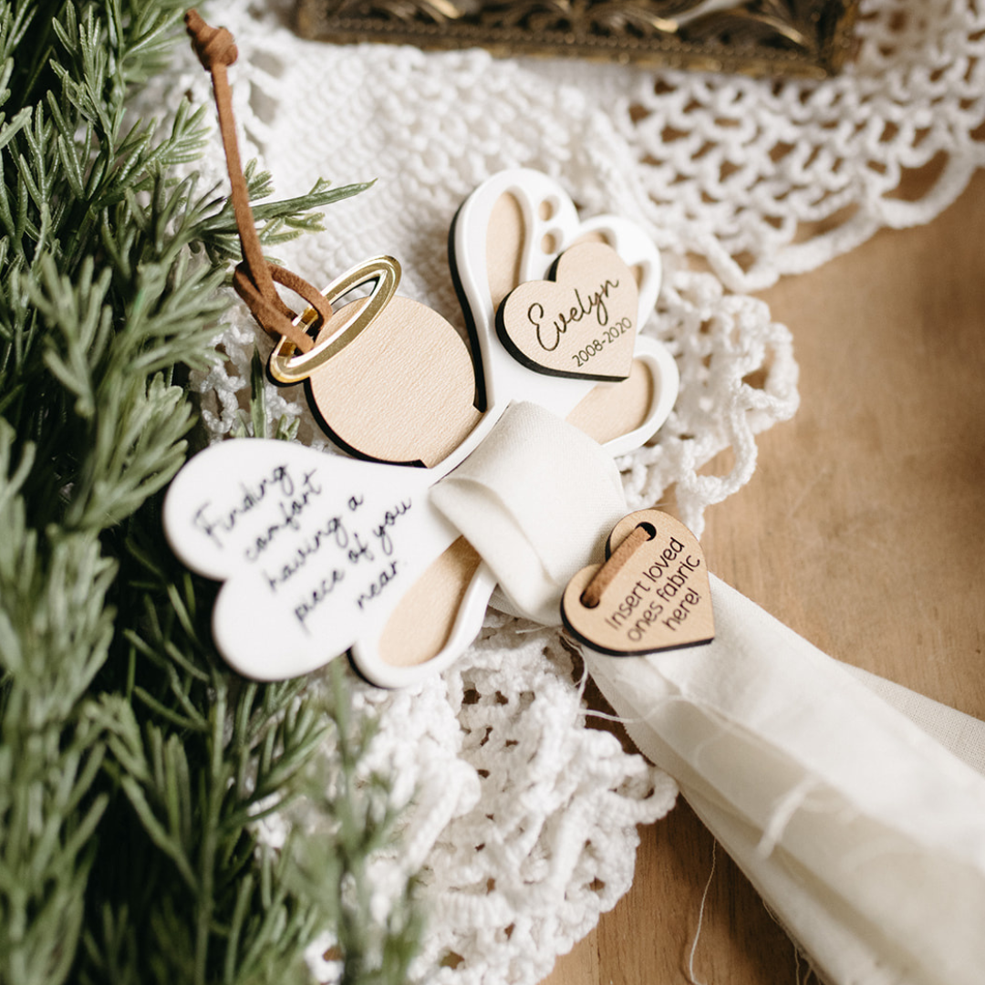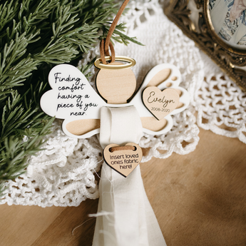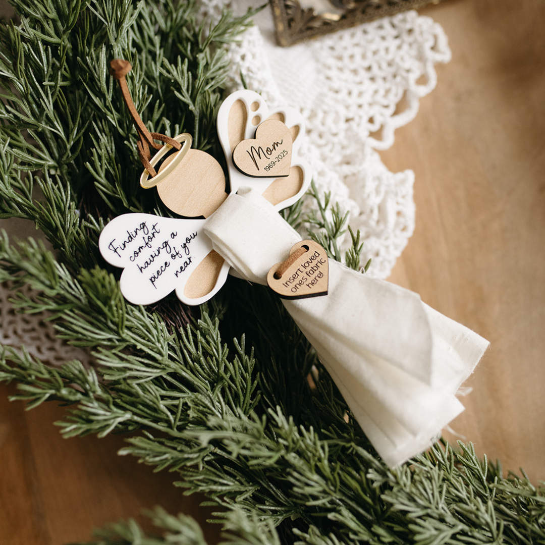 Each ornament is handmade with layered wood and acrylic, designed to frame your special piece of fabric securely. The angel’s wings feature the heartfelt message “Finding comfort having a piece of you near” and can be personalized with a name and years to make it uniquely yours. A tissue insert is included as a placeholder and easy template for cutting your fabric to size, ensuring a perfect fit.
