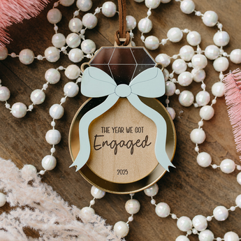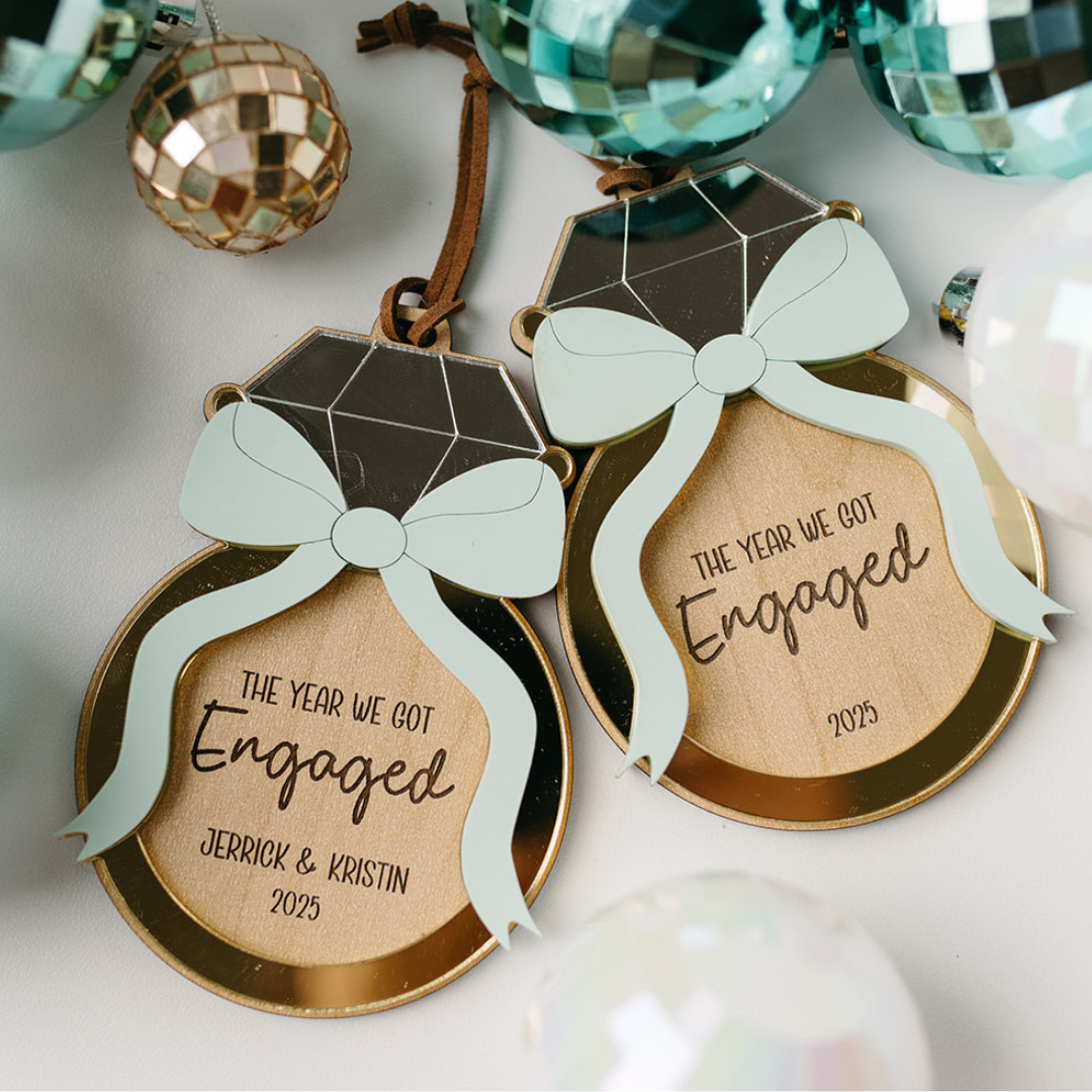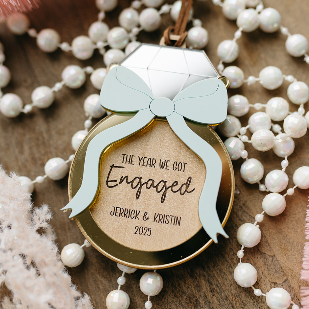 Featuring a mirrored gold acrylic ring design topped with a sparkling diamond accent, this keepsake symbolizes the joy of saying 'yes' to a lifetime together. Perfect for marking the first step in your journey, it’s a timeless reminder of a holiday season filled with love, hope, and the promise of what’s to come.