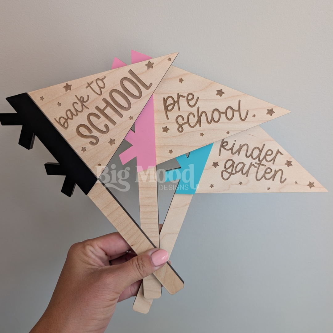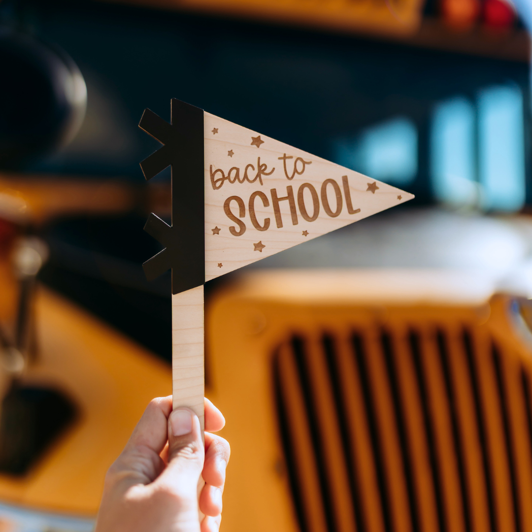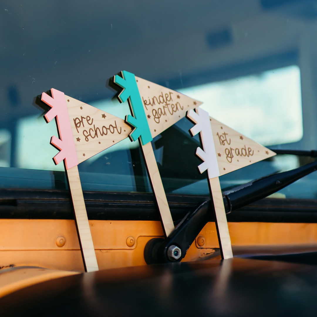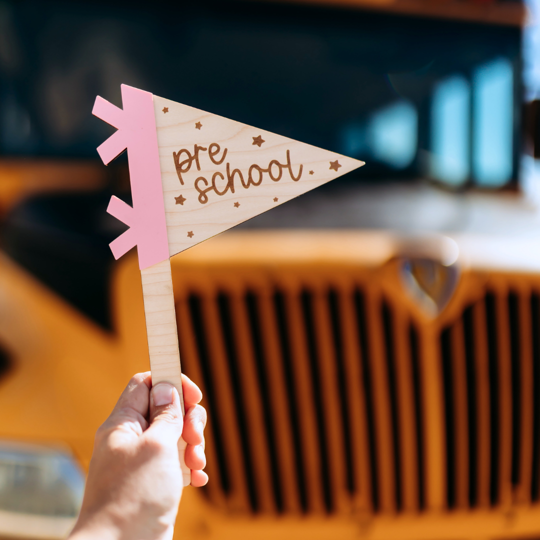 Make those first day of school photos extra special with our Personalized Pennant Flags!  Perfectly sized for little hands, these flags are the cutest back-to-school photo prop and a keepsake you’ll treasure forever. Each flag is personalized with your child’s grade (from Back to School and Preschool through Grade 9—or choose “Other” if you need something custom) and finished with your choice of acrylic accent color for a fun, stylish touch.